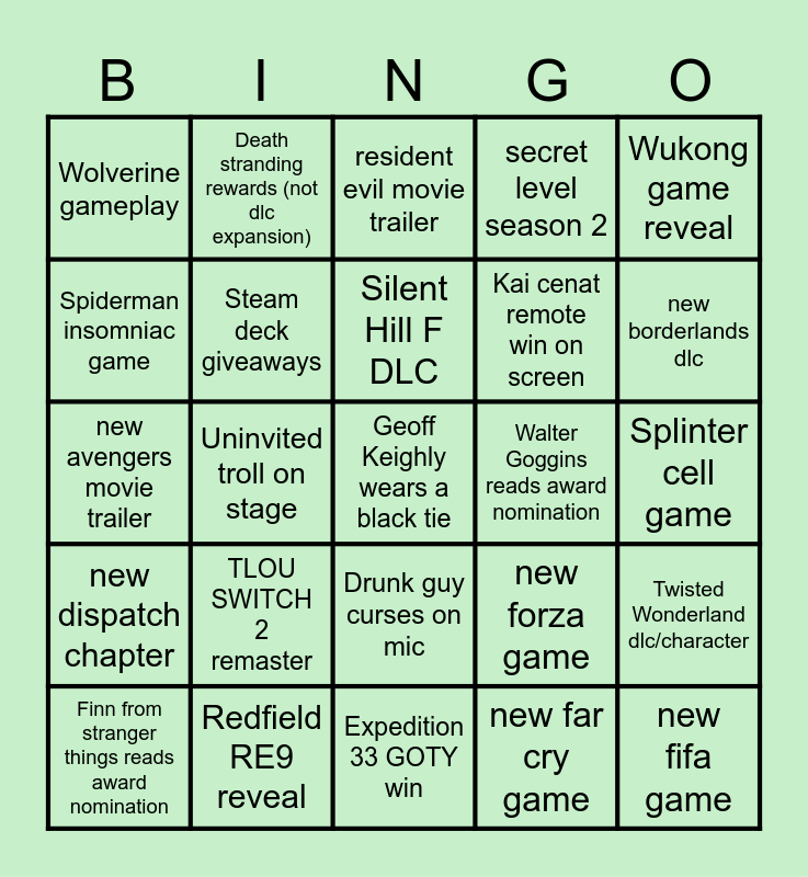 This bingo card has a free space and 24 words: TLOU SWITCH 2 remaster, Redfield RE9 reveal, Silent Hill F DLC, Finn from stranger things reads award nomination, Wukong game reveal, Wolverine gameplay, Spiderman insomniac game, Death stranding rewards (not dlc expansion), Walter Goggins reads award nomination, Drunk guy curses on mic, Kai cenat remote win on screen, new avengers movie trailer, new forza game, Twisted Wonderland dlc/character, Steam deck giveaways, new far cry game, Splinter cell game, resident evil movie trailer, new borderlands dlc, Uninvited troll on stage, new fifa game, new dispatch chapter, secret level season 2 and Expedition 33 GOTY win.