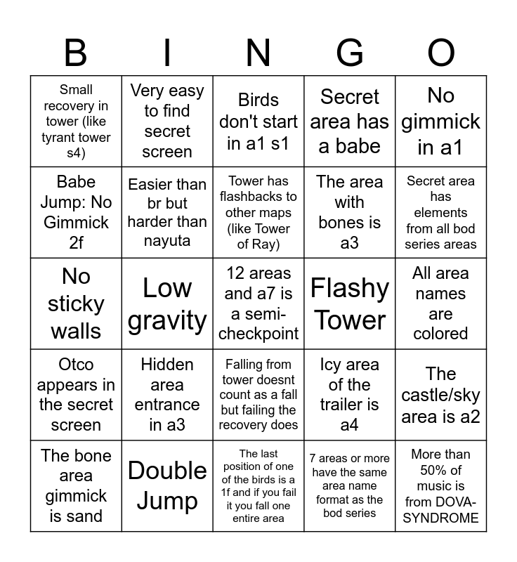 This bingo card has a free space and 24 words: Hidden area entrance in a3, Double Jump, Tower has flashbacks to other maps (like Tower of Ray), The bone area gimmick is sand, No gimmick in a1, Small recovery in tower (like tyrant tower s4), Babe Jump: No Gimmick 2f, Very easy to find secret screen, Flashy Tower, Falling from tower doesnt count as a fall but failing the recovery does, The area with bones is a3, No sticky walls, Icy area of the trailer is a4, The castle/sky area is a2, Easier than br but harder than nayuta, 7 areas or more have the same area name format as the bod series, All area names are colored, Birds don't start in a1 s1, Secret area has elements from all bod series areas, Low gravity, More than 50% of music is from DOVA-SYNDROME, Otco appears in the secret screen, Secret area has a babe and The last position of one of the birds is a 1f and if you fail it you fall one entire area.