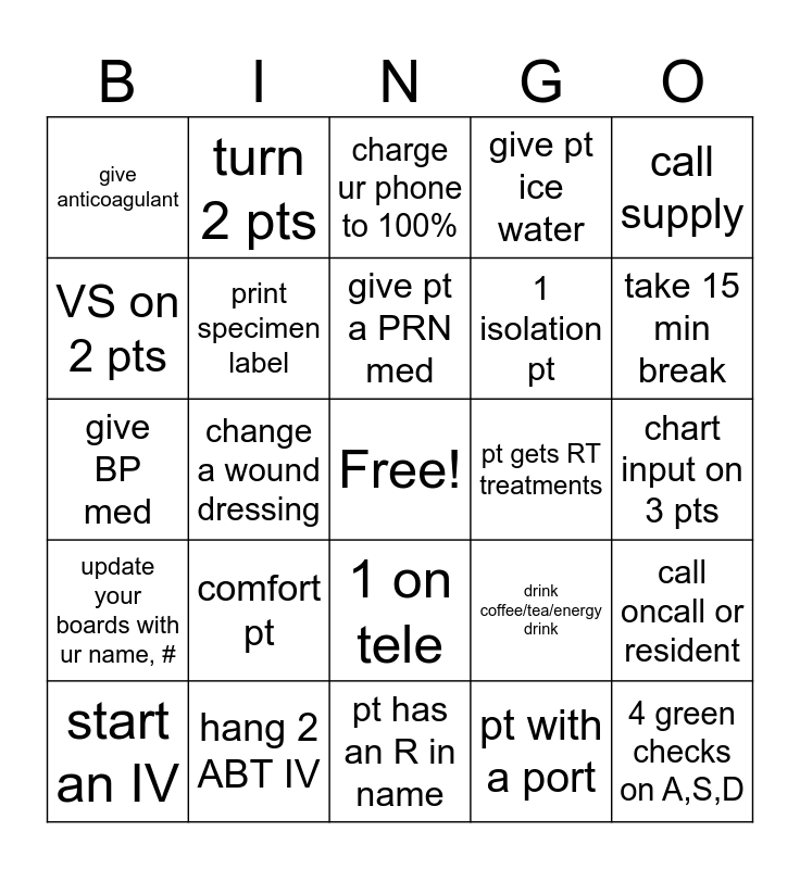 This bingo card has a free space and 26 words: 1 on tele, pt with a port, give pt a PRN med, hang 2 ABT IV, call supply, give anticoagulant, VS on 2 pts, turn 2 pts, chart input on 3 pts, drink coffee/tea/energy drink, 1 isolation pt, give BP med, call oncall or resident, start an IV, change a wound dressing, skin assessment, give pt ice water, update your boards with ur name, #, charge ur phone to 100%, 4 green checks on A,S,D, take 15 min break, pt has an R in name, pt gets RT treatments, comfort pt, print specimen label and oral care.