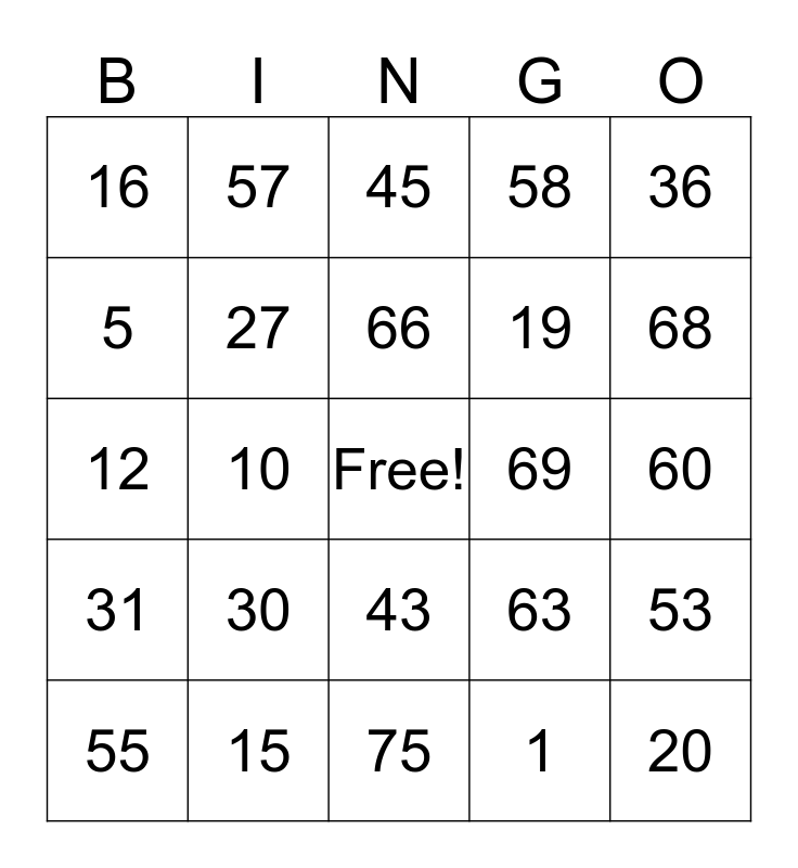 This bingo card has a free space and 24 words: 30, 15, 66, 55, 36, 16, 5, 57, 69, 43, 19, 12, 63, 53, 27, 1, 60, 45, 68, 10, 20, 31, 58 and 75.