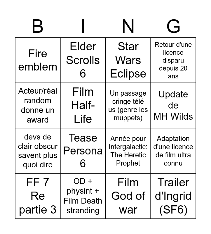 This bingo card has 16 words: OD + physint + Film Death stranding, Adaptation d'une licence de film ultra connu, Star Wars Eclipse, Fire emblem, devs de clair obscur savent plus quoi dire, Elder Scrolls 6, Année pour Intergalactic: The Heretic Prophet, Film God of war, Acteur/réal random donne un award, Film Half-Life, FF 7 Re partie 3, Retour d'une licence disparu depuis 20 ans, Tease Persona 6, Update de MH Wilds, Un passage cringe télé us (genre les muppets) and Trailer d'Ingrid (SF6).