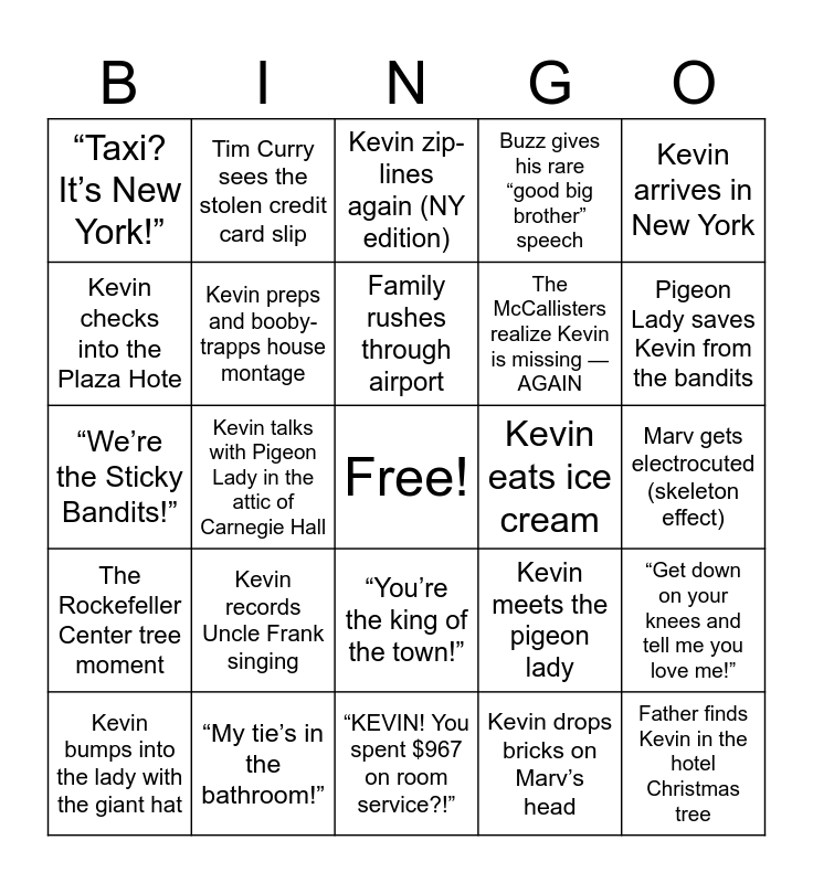 This bingo card has a free space and 24 words: Kevin records Uncle Frank singing, “My tie’s in the bathroom!”, Family rushes through airport, Kevin bumps into the lady with the giant hat, Kevin arrives in New York, “Taxi? It’s New York!”, Kevin checks into the Plaza Hote, Tim Curry sees the stolen credit card slip, Kevin eats ice cream, “You’re the king of the town!”, The McCallisters realize Kevin is missing — AGAIN, “We’re the Sticky Bandits!”, Kevin meets the pigeon lady, “Get down on your knees and tell me you love me!”, Kevin preps and booby-trapps house montage, Kevin drops bricks on Marv’s head, Marv gets electrocuted (skeleton effect), Kevin zip-lines again (NY edition), Pigeon Lady saves Kevin from the bandits, Kevin talks with Pigeon Lady in the attic of Carnegie Hall, Father finds Kevin in the hotel Christmas tree, The Rockefeller Center tree moment, Buzz gives his rare “good big brother” speech and “KEVIN! You spent $967 on room service?!”.