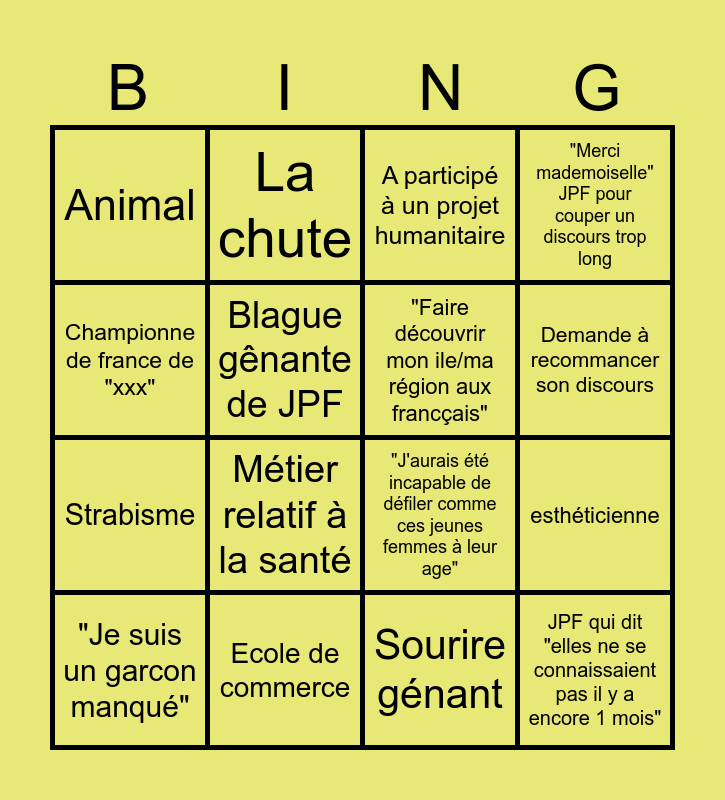 This bingo card has 16 words: Ecole de commerce, esthéticienne, A participé à un projet humanitaire, Animal, Strabisme, La chute, "J'aurais été incapable de défiler comme ces jeunes femmes à leur age", Sourire génant, Championne de france de "xxx", Blague gênante de JPF, "Je suis un garcon manqué", "Merci mademoiselle" JPF pour couper un discours trop long, Métier relatif à la santé, Demande à recommancer son discours, "Faire découvrir mon ile/ma région aux francçais" and JPF qui dit "elles ne se connaissaient pas il y a encore 1 mois".