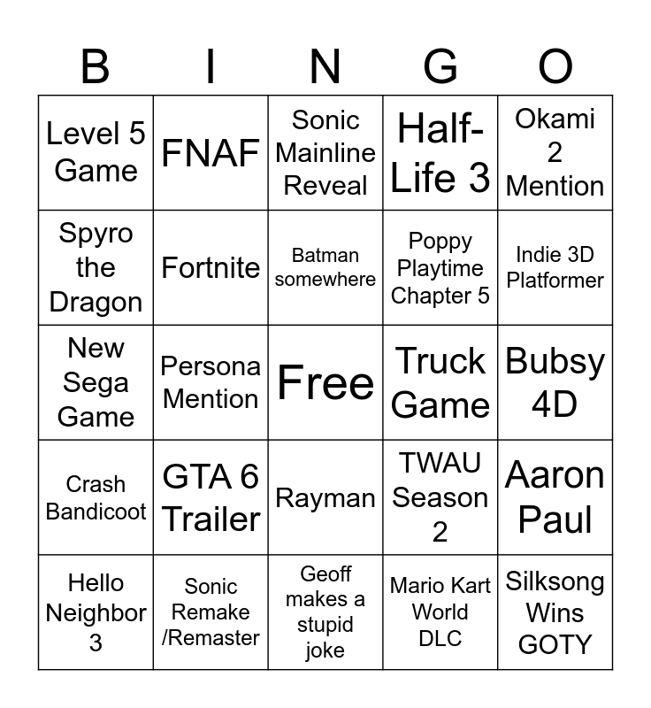 This bingo card has a free space and 24 words: GTA 6 Trailer, Sonic Remake /Remaster, Batman somewhere, Hello Neighbor 3, Okami 2 Mention, Level 5 Game, Spyro the Dragon, FNAF, Truck Game, Rayman, Poppy Playtime Chapter 5, New Sega Game, TWAU Season 2, Aaron Paul, Fortnite, Mario Kart World DLC, Bubsy 4D, Sonic Mainline Reveal, Indie 3D Platformer, Persona Mention, Silksong Wins GOTY, Crash Bandicoot, Half-Life 3 and Geoff makes a stupid joke.