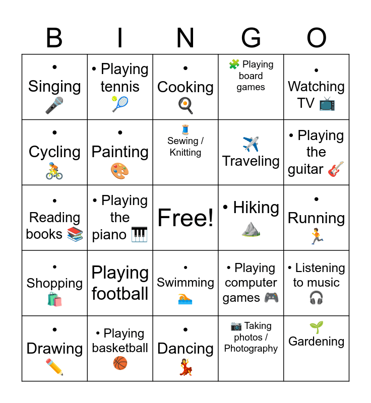 This bingo card has a free space and 24 words: Playing football, • Playing basketball 🏀, 🧵 Sewing / Knitting, • Drawing ✏️, • Watching TV 📺, • Singing 🎤, • Cycling 🚴, • Playing tennis 🎾, • Hiking ⛰️, • Swimming 🏊, ✈️ Traveling, • Reading books 📚, • Playing computer games 🎮, • Listening to music 🎧, • Painting 🎨, 📷 Taking photos / Photography, • Running 🏃, • Cooking 🍳, • Playing the guitar 🎸, • Playing the piano 🎹, 🌱 Gardening, • Shopping 🛍️, 🧩 Playing board games and • Dancing 💃.