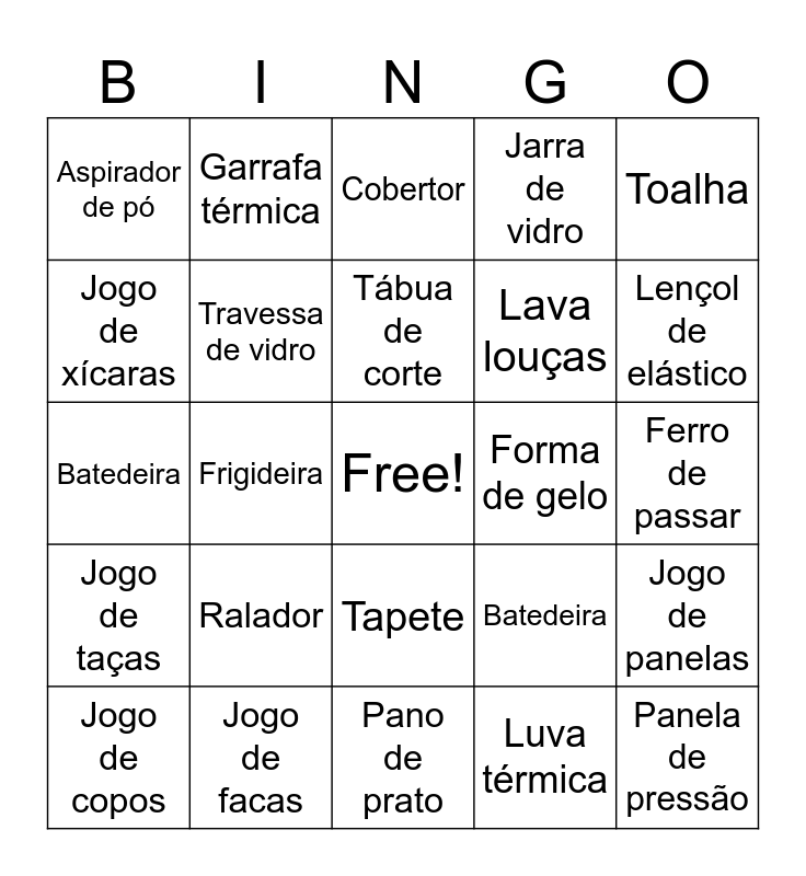 This bingo card has a free space and 25 words: Ralador, Pano de prato, Tábua de corte, Jogo de copos, Toalha, Aspirador de pó, Jogo de xícaras, Garrafa térmica, Forma de gelo, Tapete, Lava louças, Batedeira, Batedeira, Jogo de panelas, Travessa de vidro, Cobre leito, Ferro de passar, Cobertor, Lençol de elástico, Frigideira, Panela de pressão, Jogo de facas, Jogo de taças, Jarra de vidro and Luva térmica.