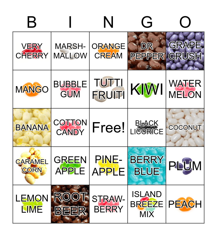 This bingo card has 29 images, a free space and 29 words: LEMON LIME, TROPICAL PUNCH, COTTON CANDY, LEMON DROP, VERY CHERRY, ORANGE CREAM, BUBBLE GUM, GREEN APPLE, BLACK LICORICE, ROOT BEER, COCONUT, PEACH, STRAW- BERRY, ISLAND BREEZE MIX, WATER MELON, MIXED BERRY, PINE- APPLE, CARAMEL CORN, GRAPE CRUSH, BANANA, BERRY BLUE, CREAM SODA, KIWI, MANGO, DR PEPPER, MARSH-MALLOW, PLUM, TUTTI FRUITI and PERFECT PEAR.
