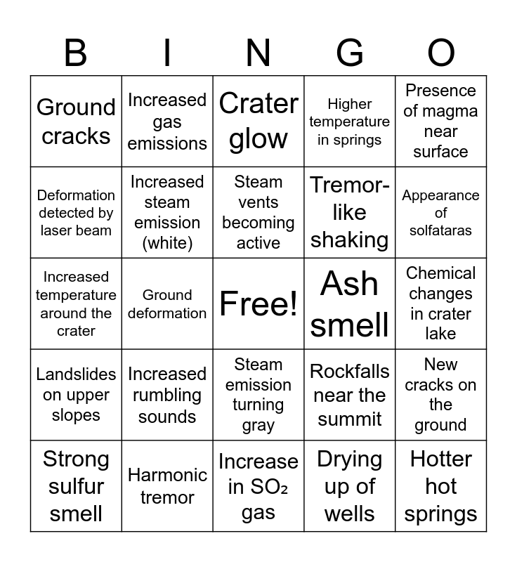 This bingo card has a free space and 30 words: Harmonic tremor, Frequent volcanic quakes, Ground deformation, Swelling of the volcano, Ground cracks, Crater glow, Increased steam emission (white), Steam emission turning gray, Ash smell, Increase in SO₂ gas, Chemical changes in crater lake, Hotter hot springs, Drying up of wells, Drying of vegetation, Appearance of solfataras, New thermal areas, Rockfalls near the summit, Landslides on upper slopes, Increased rumbling sounds, Presence of magma near surface, Increased temperature around the crater, Fumarole activity, Increased gas emissions, Tremor-like shaking, Deformation detected by laser beam, Higher temperature in springs, New cracks on the ground, Strong sulfur smell, Steam vents becoming active and Ground tilt detected by instruments.