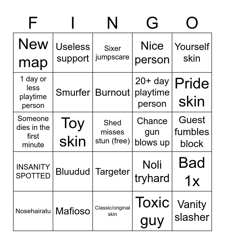 This bingo card has a free space and 24 words: Bluudud, Mafioso, Burnout, Nosehairatu, Yourself skin, New map, 1 day or less playtime person, Useless support, Chance gun blows up, Targeter, 20+ day playtime person, Someone dies in the first minute, Noli tryhard, Bad 1x, Smurfer, Toxic guy, Guest fumbles block, Sixer jumpscare, Pride skin, Toy skin, Vanity slasher, INSANITY SPOTTED, Nice person and Classic/original skin.