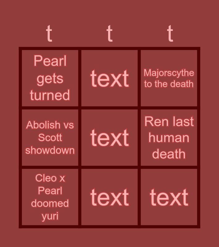 This bingo card has 41 words: text, text, text, Pearl gets turned, The castle is destroyed, text, Abolish vs Scott showdown, Apo makes it home to Cherri, text, Pyro dies violently, Shelby + Drift + Scott team up, Ren last human death, Cleo x Pearl doomed yuri, text, text, Only one person survives, The square hole kills again, Majorscythe to the death, Scott gets to monologue, text, text, text, text, text, text, text, text, text, text, text, text, text, text, text, text, text, text, text, text, text and text.