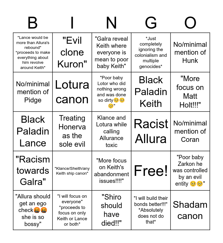 This bingo card has 25 words: "Klance/Sheith/any Keith ship canon", "Shiro should have died!!", "Poor baby Lotor who did nothing wrong and was done so dirty🥺🥺🥺", "Allura should get an ego check🤬🤬 she is so bossy", No/minimal mention of Hunk, "Lance would be more than Allura's rebound" *proceeds to make everything about him revolve around Keith", No/minimal mention of Pidge, "Evil clone Kuron", Racist Allura, "More focus on Keith's abandonment issues!!!!", Black Paladin Keith, Black Paladin Lance, Free!, "Poor baby Zarkon he was controlled by an evil entity 🥺🥺", Lotura canon, Shadam canon, No/minimal mention of Coran, "Galra reveal Keith where everyone is mean to poor baby Keith", "More focus on Matt Holt!!!", Treating Honerva as the sole evil, Klance and Lotura while calling Allurance toxic, "I will focus on everyone" *proceeds to focus on only Keith or Lance or both*, "Racism towards Galra", *Just completely ignoring the colonialism and multiple genocides* and "I will build their bonds better!!!" *Absolutely does not do that*.