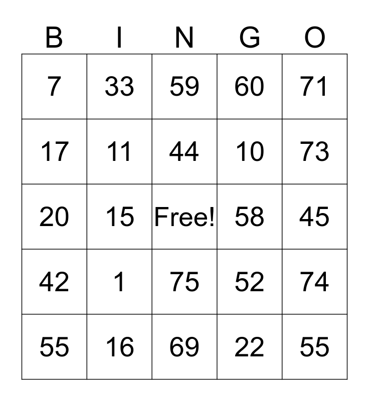 This bingo card has a free space and 24 words: 1, 16, 44, 55, 71, 7, 17, 33, 58, 75, 10, 20, 52, 74, 11, 22, 45, 59, 73, 15, 55, 42, 60 and 69.
