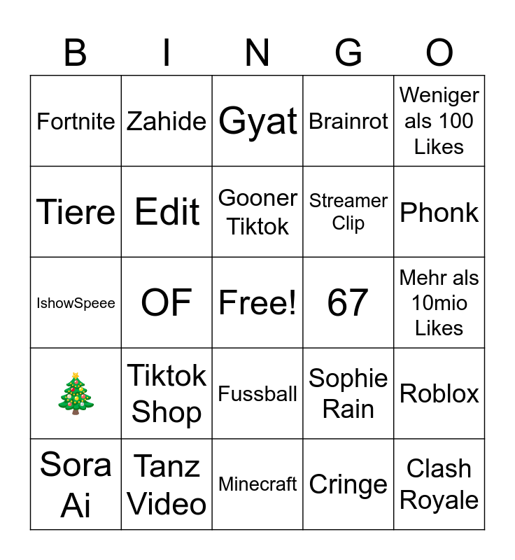 This bingo card has a free space and 24 words: Sora Ai, Tiktok Shop, Gooner Tiktok, Cringe, Weniger als 100 Likes, Fortnite, Zahide, Gyat, 67, Mehr als 10mio Likes, IshowSpeee, Edit, Sophie Rain, Roblox, Tiere, Tanz Video, Minecraft, Brainrot, Phonk, 🎄, OF, Fussball, Streamer Clip and Clash Royale.