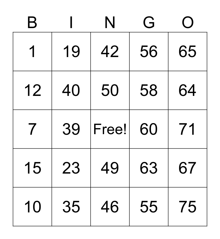 This bingo card has a free space and 24 words: 10, 23, 50, 55, 65, 1, 19, 42, 60, 71, 7, 40, 63, 67, 12, 35, 46, 56, 64, 15, 39, 49, 58 and 75.