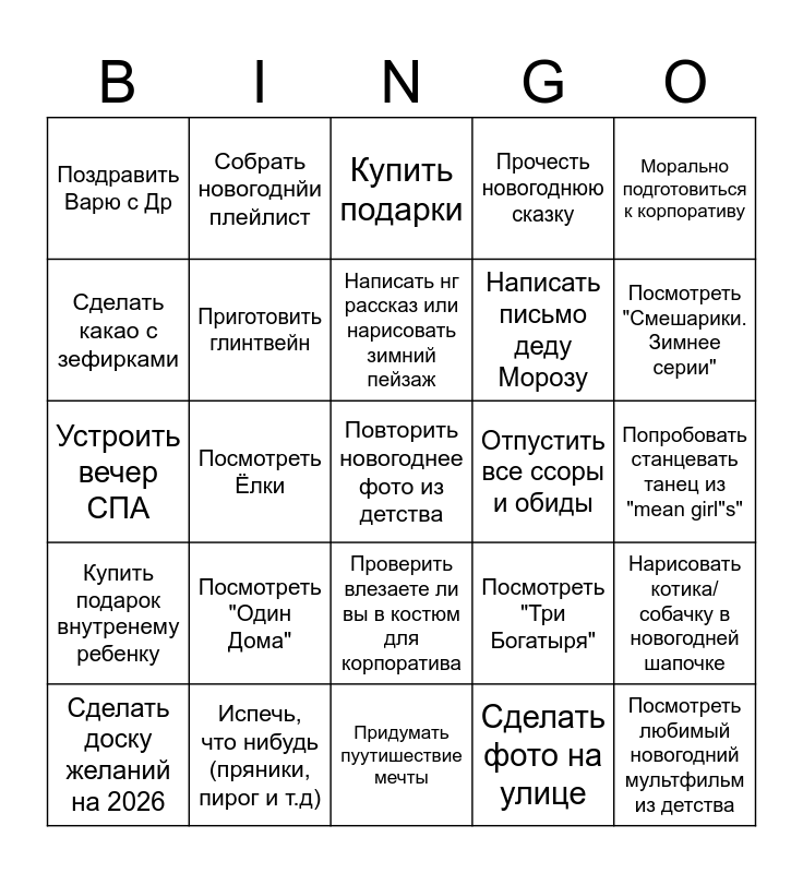 This bingo card has a free space and 24 words: Посмотреть "Один Дома", Испечь, что нибудь (пряники, пирог и т.д), Написать нг рассказ или нарисовать зимний пейзаж, Сделать доску желаний на 2026, Морально подготовиться к корпоративу, Поздравить Варю с Др, Сделать какао с зефирками, Собрать новогоднйи плейлист, Отпустить все ссоры и обиды, Проверить влезаете ли вы в костюм для корпоратива, Написать письмо деду Морозу, Устроить вечер СПА, Посмотреть "Три Богатыря", Нарисовать котика/собачку в новогодней шапочке, Приготовить глинтвейн, Сделать фото на улице, Попробовать станцевать танец из "mean girl"s", Купить подарки, Посмотреть "Смешарики. Зимнее серии", Посмотреть Ёлки, Посмотреть любимый новогодний мультфильм из детства, Купить подарок внутренему ребенку, Прочесть новогоднюю сказку and Придумать пуутишествие мечты.
