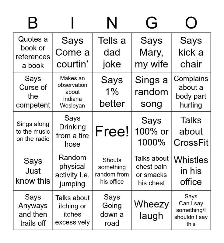 This bingo card has a free space and 24 words: Random physical activity I.e. jumping, Talks about itching or itches excessively, Says 1% better, Says Anyways and then trails off, Says kick a chair, Quotes a book or references a book, Says Curse of the competent, Says Come a courtin’, Says 100% or 1000%, Shouts something random from his office, Sings a random song, Sings along to the music on the radio, Talks about chest pain or smacks his chest, Whistles in his office, Makes an observation about Indiana Wesleyan, Wheezy laugh, Talks about CrossFit, Tells a dad joke, Complains about a body part hurting, Says Drinking from a fire hose, Says Can I say something/I shouldn’t say this, Says Just know this, Says Mary, my wife and Says Going down a road.
