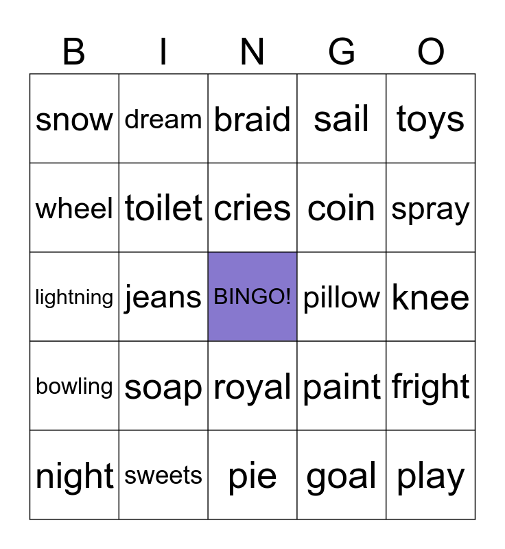 This bingo card has a free space and 24 words: soap, sweets, cries, night, toys, snow, wheel, dream, pillow, royal, coin, lightning, paint, fright, toilet, goal, knee, braid, spray, jeans, play, bowling, sail and pie.
