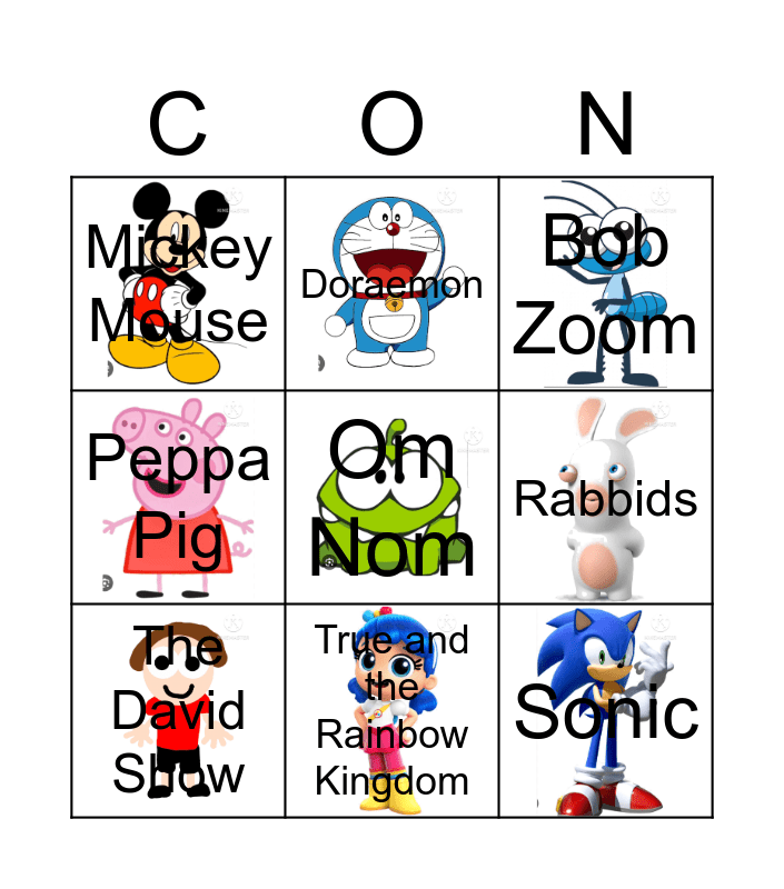 This bingo card has 9 images and 9 words: The David Show, Bob Zoom, Doraemon, Peppa Pig, Mickey Mouse, Rabbids, Om Nom, Sonic and True and the Rainbow Kingdom.