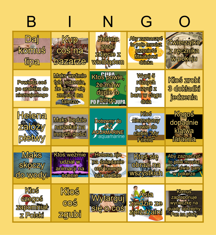 This bingo card has 28 images, a free space and 30 words: Ktoś coś zgubi, Maks weźmie od razu dwa drinks bo po co chodzić dwa razy, Maks będzie narzekał na innych gości, Mikołaj się spali na słońcu, Daj komuś tipa, Helena zrobi zdjęcie z wielbłądem, Maks weźmie tyle jedzenia, że ledwo się zmieści na talerzu, Helena zje na śniadanie coś innego niż słodkie, Ktoś nieznajomy powie do ciebie "My Friend", Wytarguj się o coś, Kogoś dopadnie klątwa faraona, Komuś zaproponuje wycieczkę na quady uprzejmy Pan na plaży, Asia zjedzie ze zjeżdżalni, Egipcjanin powie coś po polsku, Ktoś zrobi 3 dokładki jedzenia, Aby zaznaczyć to pole musisz przynieść drinki dla pozostałych graczy, Ktoś się obrazi na wszystkich, Maks skoczy do wody., Ktoś weźmie udział w animacji na scenie, Zwierzątko z ręcznika w pokoju, Helena założy płetwy, Ktoś nie wstanie na śniadanie, Kup coś na bazarze, Wypij 5 różnych pozycji z baru w ciągu dnia, Powiedz coś po arabsku do nieznajomego, Aby zaznaczyć to pole musisz przynieść Mikołajowi drinka, Aby zaznaczyć to pole musisz mieć dwie pary w pokerze, Ktoś czegoś zapomniał z Polski, Ktoś powie, że ma w dupie to bingo and Powiedz komuś komplement.