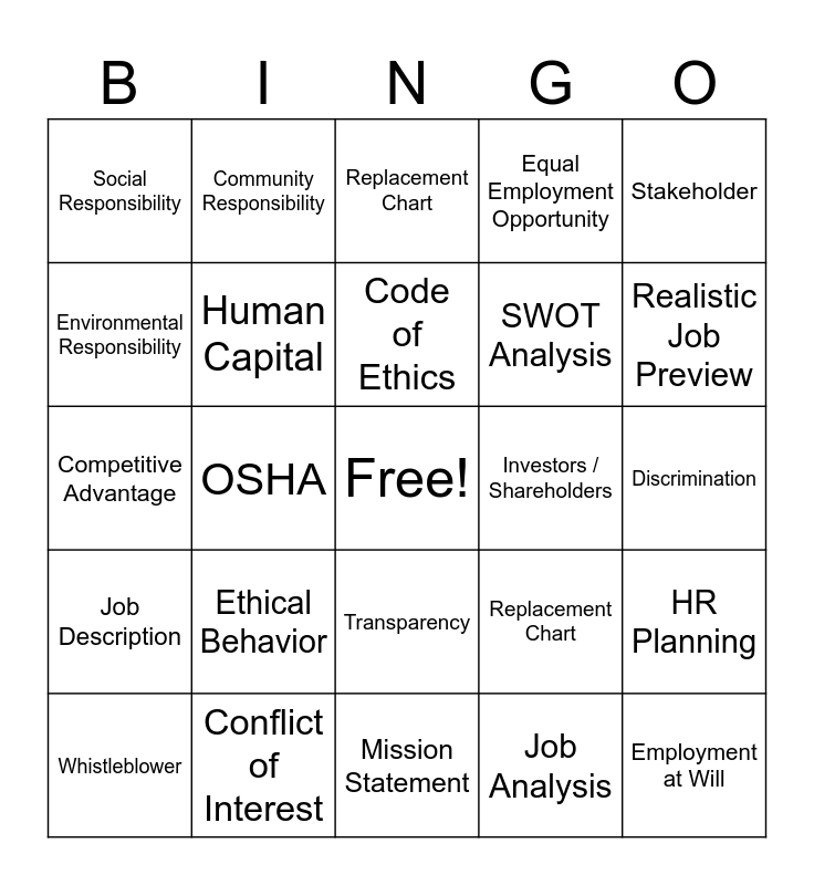 This bingo card has a free space and 24 words: Ethical Behavior, Conflict of Interest, Code of Ethics, Whistleblower, Stakeholder, Social Responsibility, Environmental Responsibility, Community Responsibility, Investors / Shareholders, Transparency, SWOT Analysis, Competitive Advantage, Replacement Chart, HR Planning, Human Capital, Job Analysis, Discrimination, Replacement Chart, Realistic Job Preview, OSHA, Employment at Will, Job Description, Equal Employment Opportunity and Mission Statement.