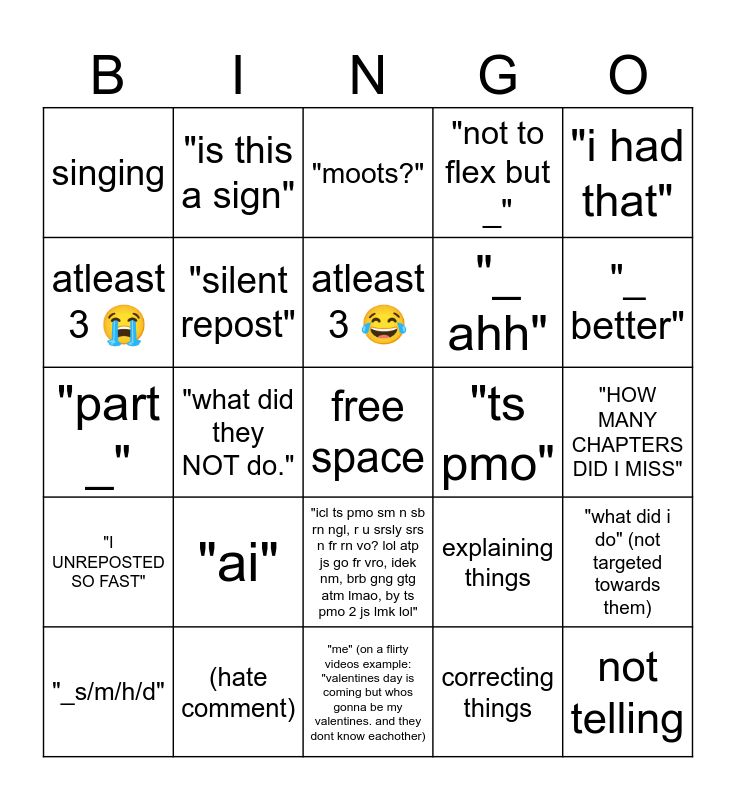 This bingo card has a free space and 24 words: "ai", (hate comment), atleast 3 😂, "_s/m/h/d", "i had that", singing, atleast 3 ðŸ˜, "is this a sign", "ts pmo", "icl ts pmo sm n sb rn ngl, r u srsly srs n fr rn vo? lol atp js go fr vro, idek nm, brb gng gtg atm lmao, by ts pmo 2 js lmk lol", "_ ahh", "part _", explaining things, "what did i do" (not targeted towards them), "silent repost", correcting things, "HOW MANY CHAPTERS DID I MISS", "moots?", "_ better", "what did they NOT do.", not telling, "I UNREPOSTED SO FAST", "not to flex but _" and "me" (on a flirty videos example: "valentines day is coming but whos gonna be my valentines. and they dont know eachother).