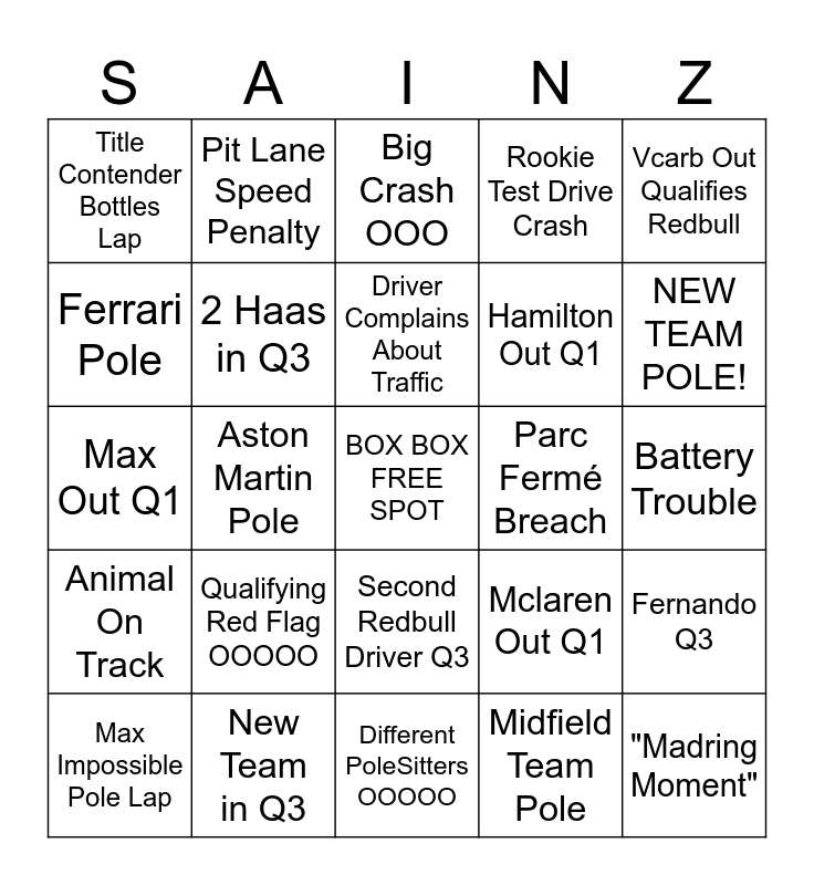 This bingo card has a free space and 24 words: Qualifying Red Flag OOOOO, New Team in Q3, Driver Complains About Traffic, Max Impossible Pole Lap, Vcarb Out Qualifies Redbull, Title Contender Bottles Lap, Ferrari Pole, Pit Lane Speed Penalty, Parc Fermé Breach, Second Redbull Driver Q3, Hamilton Out Q1, Max Out Q1, Mclaren Out Q1, Fernando Q3, 2 Haas in Q3, Midfield Team Pole, Battery Trouble, Big Crash OOO, NEW TEAM POLE!, Aston Martin Pole, "Madring Moment", Animal On Track, Rookie Test Drive Crash and Different PoleSitters OOOOO.