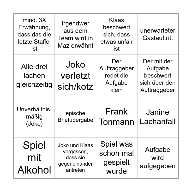 This bingo card has 16 words: Joko und Klaas vergessen, dass sie gegeneinander antreten, Janine Lachanfall, Klaas beschwert sich, dass etwas unfair ist, mind. 3X Erwähnung, dass das die letzte Staffel ist, Unverhältnis-mäßig (Joko), Irgendwer aus dem Team wird in Maz erwähnt, Frank Tonmann, Spiel was schon mal gespielt wurde, Alle drei lachen gleichzeitig, Joko verletzt sich/kotz, Spiel mit Alkohol, unerwarteter Gastauftritt, epische Briefübergabe, Der mit der Aufgabe beschwert sich über den Auftraggeber, Der Auftraggeber redet die Aufgabe klein and Aufgabe wird aufgegeben.