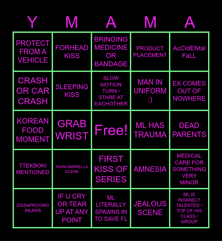 This bingo card has a free space and 24 words: DISSAPROVING INLAWS, RAIN/UMBRELLA SCENE, SLOW MOTION TURN / STARE AT EACHOTHER, JEALOUS SCENE, AcCIdENtal FaLL, PROTECT FROM A VEHICLE, FORHEAD KISS, BRINGING MEDICINE OR BANDAGE, ML HAS TRAUMA, DEAD PARENTS, KOREAN FOOD MOMENT, SLEEPING KISS, AMNESIA, MEDICAL CARE FOR SOMETHING VERY MINOR, CRASH OR CAR CRASH, IF U CRY OR TEAR UP AT ANY POINT, ML LITERALLY SPAWNS IN TO SAVE FL, PRODUCT PLACEMENT, EX COMES OUT OF NOWHERE, TTEKBOKI MENTIONED, GRAB WRIST, FIRST KISS OF SERIES, MAN IN UNIFORM ;) and ML IS INSANELY TALENTED / TOP OF HIS CLASS / GROUP.