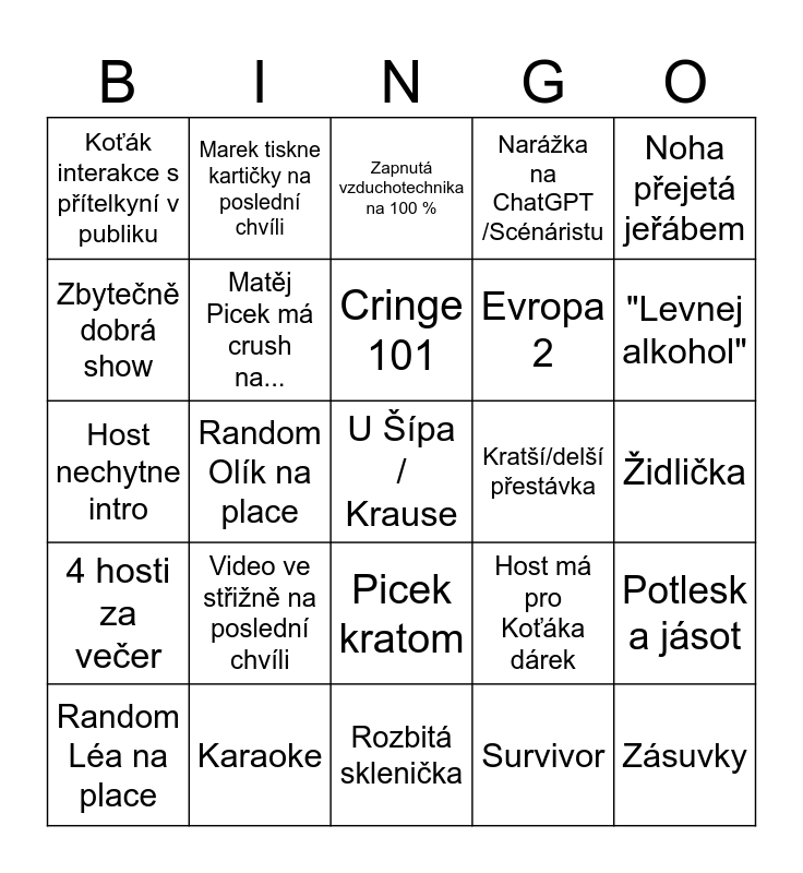 This bingo card has 40 words: Kluci ke kamerám, Host nechytne intro, Koťák neví, do které kamery se loučit, Matěj Picek má crush na..., Karaoke, Picek kratom, Cringe 101, Koťákovi nechutná, co pije, Noha přejetá jeřábem, 4 hosti za večer, Random Olík na place, Narážka na ChatGPT /Scénáristu, U Šípa / Krause, Židlička, Kratší/delší přestávka, Video ve střižně na poslední chvíli, Bořek Mekáč delivery, Koťák interakce s přítelkyní v publiku, Random Terka na place, Zapnutá vzduchotechnika na 100 %, Potlesk a jásot, Survivor, Evropa 2, Zbytečně dobrá show, Přišli jste na mě ne na hosta, Naked atraction během rozhovoru, Sexuální narážka, Vtip na termín publikace, Zásuvky, Sexuální obtěžování na pracovišti, Báry crush, Random Léa na place, Spicy otázka, která nedává smysl, Host má pro Koťáka dárek, "Levnej alkohol", Rozbitá sklenička, Nefunkční Nucleus, Koťák chce mluvit do VO pauzy, Marek tiskne kartičky na poslední chvíli and Tománek je Debil.