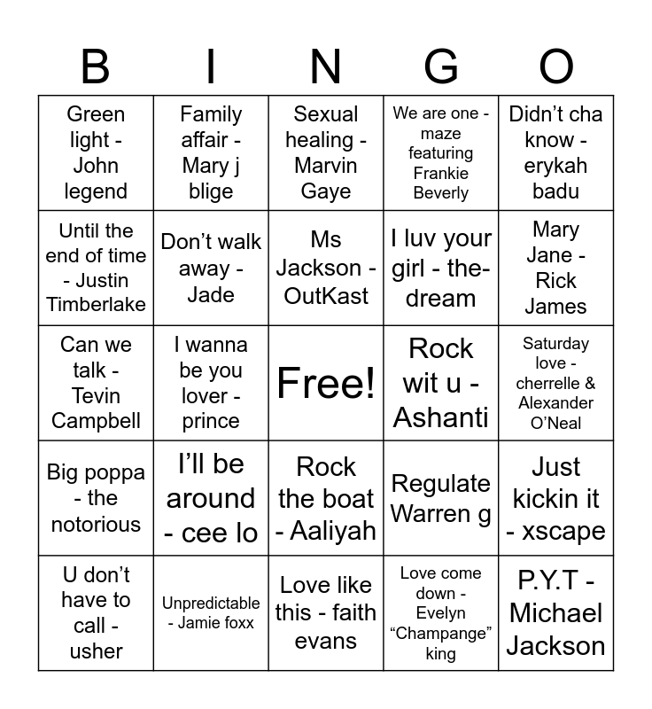 This bingo card has a free space and 24 words: I’ll be around - cee lo, Unpredictable - Jamie foxx, Ms Jackson - OutKast, U don’t have to call - usher, Didn’t cha know - erykah badu, Green light - John legend, Until the end of time - Justin Timberlake, Family affair - Mary j blige, Rock wit u - Ashanti, Rock the boat - Aaliyah, I luv your girl - the-dream, Can we talk - Tevin Campbell, Regulate Warren g, Just kickin it - xscape, Don’t walk away - Jade, Love come down - Evelyn “Champange” king, Saturday love - cherrelle & Alexander O’Neal, Sexual healing - Marvin Gaye, Mary Jane - Rick James, I wanna be you lover - prince, P.Y.T - Michael Jackson, Big poppa - the notorious, We are one - maze featuring Frankie Beverly and Love like this - faith evans.