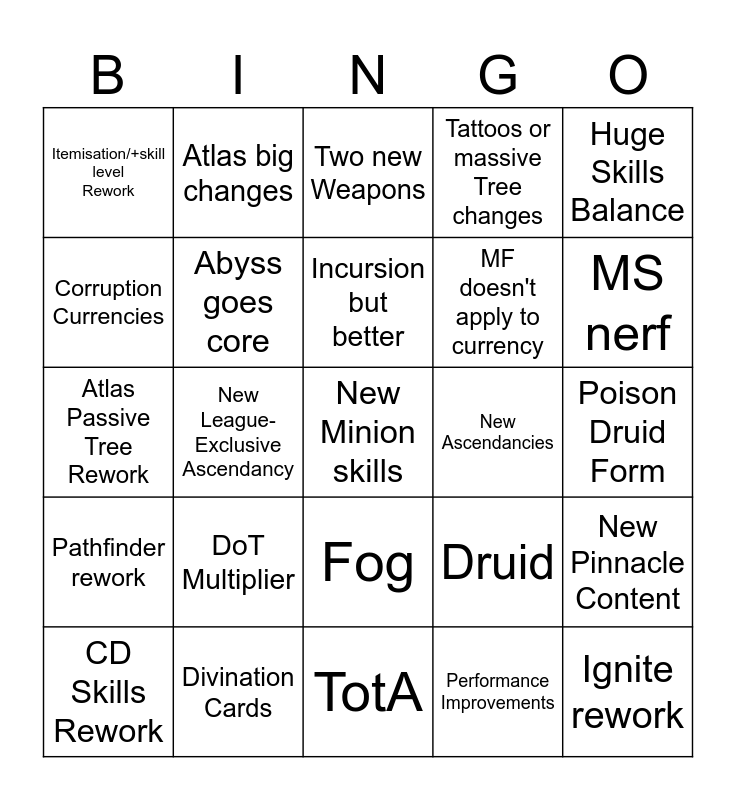 This bingo card has 25 words: DoT Multiplier, TotA, Incursion but better, CD Skills Rework, Huge Skills Balance, Itemisation/+skill level Rework, Corruption Currencies, Atlas big changes, New Ascendancies, Fog, MF doesn't apply to currency, Atlas Passive Tree Rework, Druid, New Pinnacle Content, Abyss goes core, Ignite rework, Poison Druid Form, Two new Weapons, MS nerf, New League-Exclusive Ascendancy, New Minion skills, Divination Cards, Pathfinder rework, Tattoos or massive Tree changes and Performance Improvements.