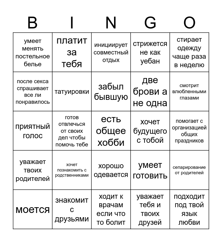 This bingo card has a free space and 24 words: хочет познакомить с родственниками, знакомит с друзьями, забыл бывшую, моется, стирает одежду чаще раза в неделю, умеет менять постельное белье, после секса спрашивает все ли понравилось, платит за тебя, хочет будущего с тобой, хорошо одевается, две брови а не одна, приятный голос, умеет готовить, сепарирование от родителей, татуировки, уважает тебя и твоих друзей, помогает с организацией общих праздников, инициирует совместный отдых, смотрит влюбленными глазами, готов отвлечься от своих дел чтобы помочь тебе, подходит под твой язык любви, уважает твоих родителей, стрижется не как уебан and ходит к врачам если что то болит.