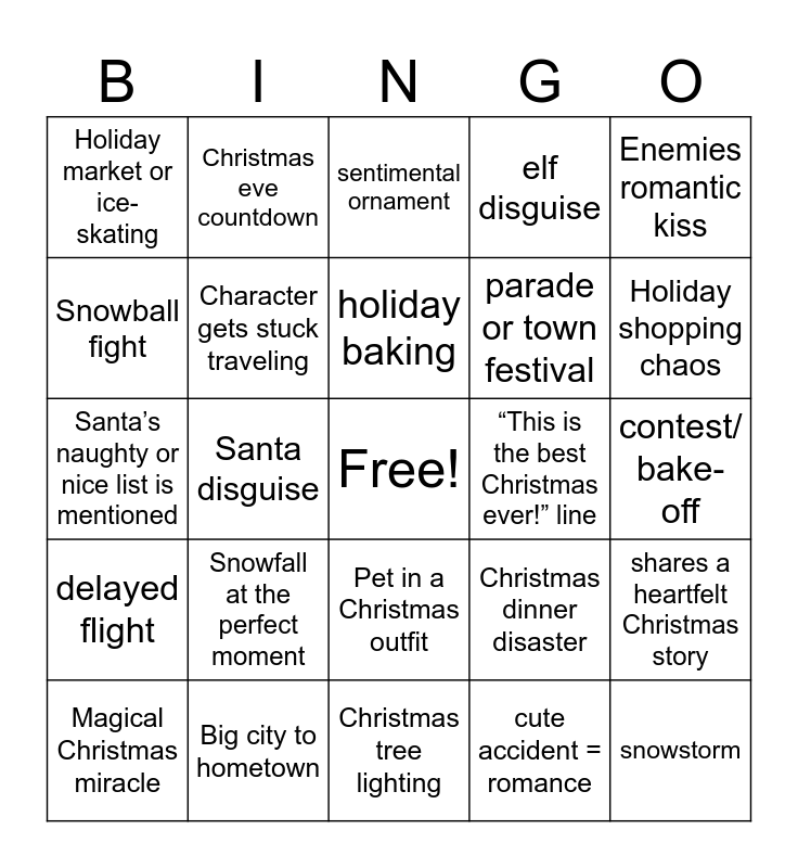 This bingo card has a free space and 24 words: Snowfall at the perfect moment, Big city to hometown, holiday baking, Magical Christmas miracle, Enemies romantic kiss, Holiday market or ice-skating, Snowball fight, Christmas eve countdown, “This is the best Christmas ever!” line, Pet in a Christmas outfit, parade or town festival, Santa’s naughty or nice list is mentioned, Christmas dinner disaster, shares a heartfelt Christmas story, Character gets stuck traveling, cute accident = romance, contest/ bake-off, sentimental ornament, Holiday shopping chaos, Santa disguise, snowstorm, delayed flight, elf disguise and Christmas tree lighting.