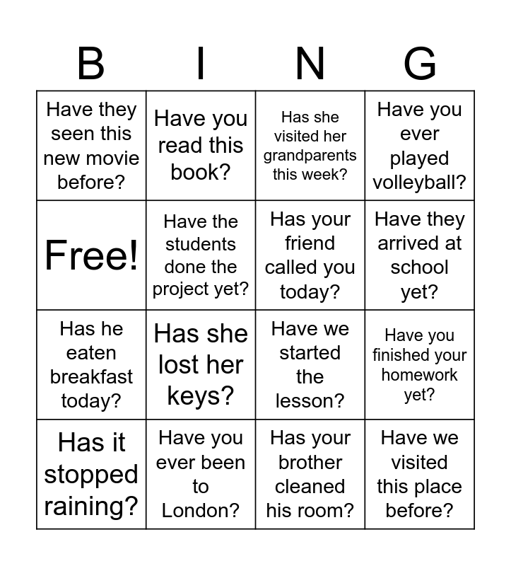 This bingo card has 16 words: Have you ever been to London?, Have you finished your homework yet?, Has she visited her grandparents this week?, Have they seen this new movie before?, Has he eaten breakfast today?, Have you read this book?, Have we started the lesson?, Has your brother cleaned his room?, Free!, Have the students done the project yet?, Has it stopped raining?, Have you ever played volleyball?, Has she lost her keys?, Have they arrived at school yet?, Has your friend called you today? and Have we visited this place before?.