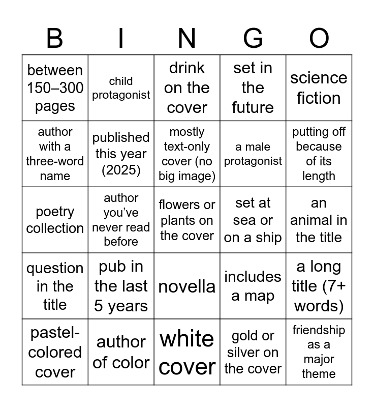 This bingo card has 25 words: pub in the last 5 years, white cover, mostly text-only cover (no big image), pastel-colored cover, science fiction, between 150–300 pages, author with a three-word name, child protagonist, set at sea or on a ship, novella, a male protagonist, poetry collection, includes a map, a long title (7+ words), published this year (2025), friendship as a major theme, an animal in the title, drink on the cover, putting off because of its length, author you’ve never read before, flowers or plants on the cover, author of color, question in the title, set in the future and gold or silver on the cover.