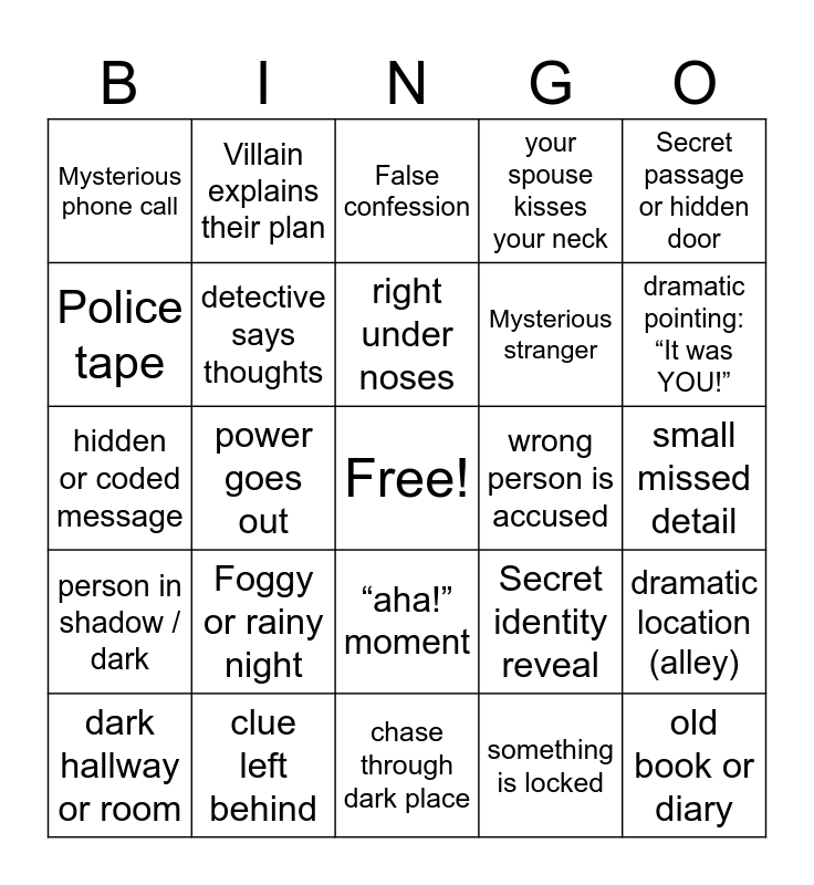 This bingo card has a free space and 24 words: Foggy or rainy night, clue left behind, right under noses, dark hallway or room, Secret passage or hidden door, Mysterious phone call, Police tape, Villain explains their plan, wrong person is accused, “aha!” moment, Mysterious stranger, hidden or coded message, Secret identity reveal, dramatic location (alley), detective says thoughts, something is locked, small missed detail, False confession, dramatic pointing: “It was YOU!”, power goes out, old book or diary, person in shadow / dark, your spouse kisses your neck and chase through dark place.