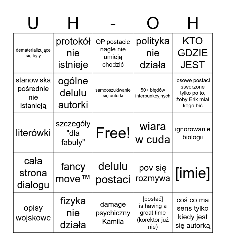 This bingo card has a free space and 24 words: fancy move™, fizyka nie działa, samooszukiwanie się autorki, opisy wojskowe, KTO GDZIE JEST, dematerializujące się byty, stanowiska pośrednie nie istanieją, protokół nie istnieje, wiara w cuda, delulu postaci, 50+ błędów interpunkcyjnych, literówki, pov się rozmywa, [imie], ogólne delulu autorki, [postać] is having a great time (korektor już nie), ignorowanie biologii, OP postacie nagle nie umieją chodzić, losowe postaci stworzone tylko po to, żeby Erik miał kogo bić, szczegóły "dla fabuły", coś co ma sens tylko kiedy jest się autorką, cała strona dialogu, polityka nie działa and damage psychiczny Kamila.