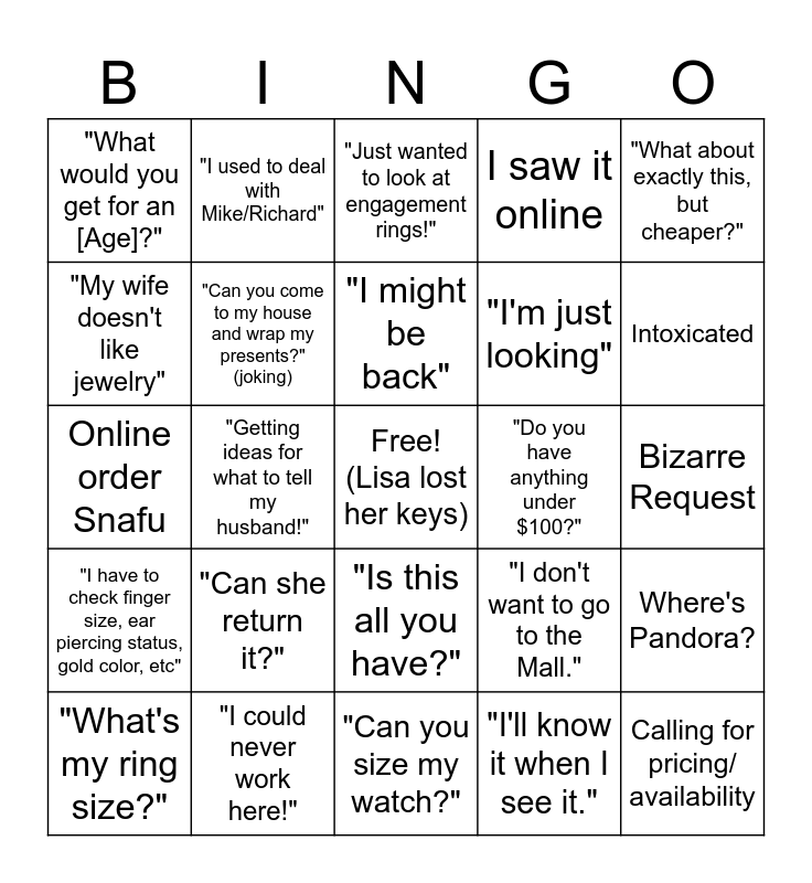 This bingo card has a free space and 38 words: "Why can't you change my watch battery now?", "Two WEEKS for repairs?", "Its going to take THAT long to come in?", "Can you come to my house and wrap my presents?" (joking), Where's Pandora?, "Can she return it?", "I might be back", "Do you have anything less expensive?", "What about exactly this, but cheaper?", "I'm just looking", "Getting ideas for what to tell my husband!", I saw it online, Calling for pricing/ availability, Bizarre Request, "My wife doesn't like jewelry", "I have to check finger size, ear piercing status, gold color, etc", "Oh I just wanted to get my ring checked and cleaned", "Just wanted to look at engagement rings!", "Where are your [generic jewelry category]?", "Do you have anything under $100?", "What would you get for an [Age]?", "I could never work here!", Intoxicated, "What's my ring size?", "I dunno", "Can you size my watch?", "She has everything", "How long will it take to be sized?", "Can I talk to the jeweler?", "They never gave me a claim slip.", At the door at 9:50am or earlier., "Is this all you have?", "I'll know it when I see it.", "I used to deal with Mike/Richard", "I know all the Hannoushes!", "I don't want to go to the Mall.", Online order Snafu and "Can I have/buy a box?".