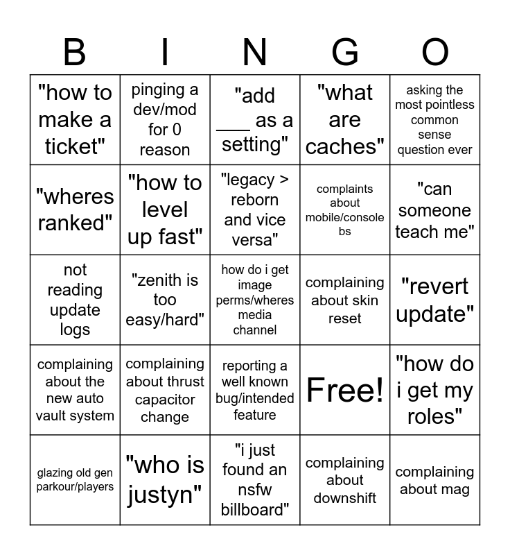 This bingo card has 25 words: complaining about thrust capacitor change, "i just found an nsfw billboard", "legacy > reborn and vice versa", glazing old gen parkour/players, asking the most pointless common sense question ever, "how to make a ticket", "wheres ranked", pinging a dev/mod for 0 reason, complaining about skin reset, reporting a well known bug/intended feature, complaints about mobile/console bs, not reading update logs, Free!, "how do i get my roles", "how to level up fast", complaining about mag, "revert update", "add ___ as a setting", "can someone teach me", "zenith is too easy/hard", how do i get image perms/wheres media channel, "who is justyn", complaining about the new auto vault system, "what are caches" and complaining about downshift.