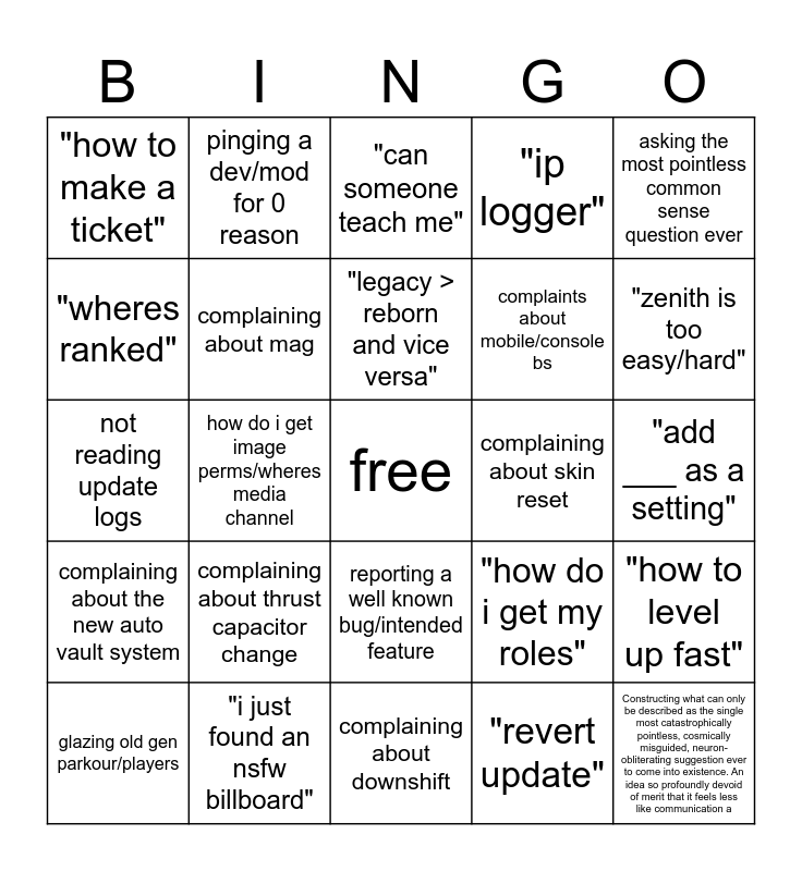 This bingo card has a free space and 24 words: complaining about thrust capacitor change, "i just found an nsfw billboard", "legacy > reborn and vice versa", glazing old gen parkour/players, asking the most pointless common sense question ever, "how to make a ticket", "wheres ranked", pinging a dev/mod for 0 reason, complaining about skin reset, reporting a well known bug/intended feature, complaints about mobile/console bs, not reading update logs, "how do i get my roles", "how to level up fast", complaining about mag, "revert update", "add ___ as a setting", "can someone teach me", "zenith is too easy/hard", how do i get image perms/wheres media channel, Constructing what can only be described as the single most catastrophically pointless, cosmically misguided, neuron-obliterating suggestion ever to come into existence. An idea so profoundly devoid of merit that it feels less like communication a, complaining about the new auto vault system, "ip logger" and complaining about downshift.