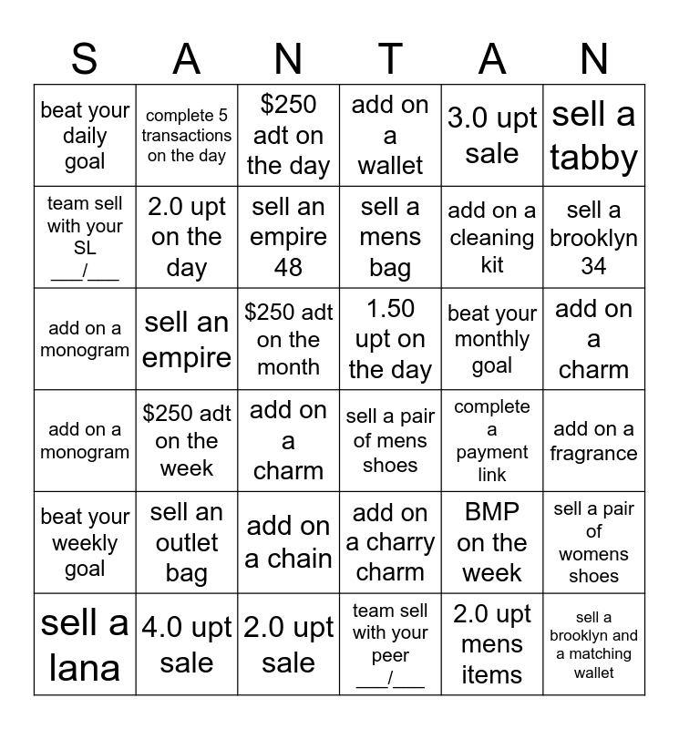 This bingo card has 36 words: add on a charry charm, add on a chain, team sell with your peer ___/___, team sell with your SL ___/___, add on a monogram, 1.50 upt on the day, 2.0 upt on the day, 2.0 upt sale, 3.0 upt sale, BMP on the week, sell a brooklyn 34, add on a wallet, sell a pair of womens shoes, sell an empire, sell a mens bag, beat your daily goal, beat your weekly goal, beat your monthly goal, add on a monogram, $250 adt on the day, $250 adt on the month, $250 adt on the week, sell a pair of mens shoes, add on a charm, complete a payment link, complete 5 transactions on the day, add on a cleaning kit, 4.0 upt sale, sell an empire 48, sell a tabby, sell a brooklyn and a matching wallet, sell a lana, add on a fragrance, add on a charm, sell an outlet bag and 2.0 upt mens items.
