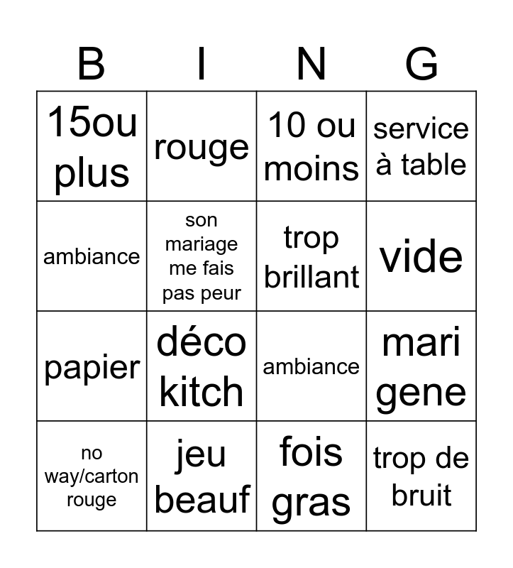 This bingo card has 16 words: jeu beauf, mari gene, 10 ou moins, 15ou plus, papier, rouge, ambiance, fois gras, ambiance, son mariage me fais pas peur, no way/carton rouge, service à table, déco kitch, vide, trop brillant and trop de bruit.