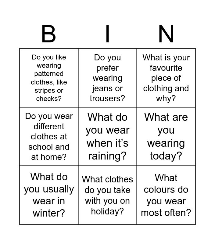 This bingo card has a free space and 8 words: What are you wearing today?, What is your favourite piece of clothing and why?, Do you prefer wearing jeans or trousers?, What do you usually wear in winter?, Do you like wearing patterned clothes, like stripes or checks?, What colours do you wear most often?, Do you wear different clothes at school and at home? and What clothes do you take with you on holiday?.