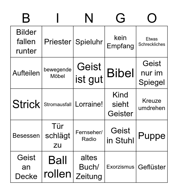 This bingo card has a free space and 24 words: Geist an Decke, Tür schlägt zu, Geist ist gut, Exorzismus, Etwas Schreckliches, Bilder fallen runter, Priester, Spieluhr, Kind sieht Geister, Kreuze umdrehen, Strick, bewegende Möbel, Geist in Stuhl, Puppe, Aufteilen, Ball rollen, altes Buch/ Zeitung, kein Empfang, Geist nur im Spiegel, Besessen, Stromausfall, Fernseher/ Radio, Bibel and Geflüster.