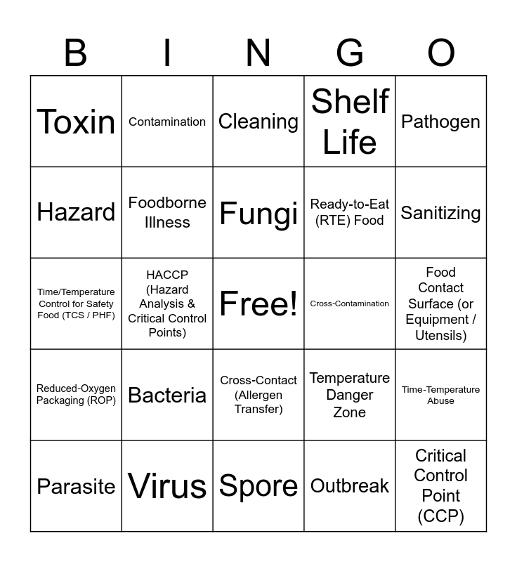 This bingo card has a free space and 24 words: Bacteria, Virus, Fungi, Parasite, Pathogen, Toxin, Hazard, Contamination, Cross‑Contamination, Cross‑Contact (Allergen Transfer), Ready‑to‑Eat (RTE) Food, Time/Temperature Control for Safety Food (TCS / PHF), Temperature Danger Zone, Time‑Temperature Abuse, Foodborne Illness, Outbreak, Food Contact Surface (or Equipment / Utensils), Cleaning, Sanitizing, HACCP (Hazard Analysis & Critical Control Points), Critical Control Point (CCP), Reduced‑Oxygen Packaging (ROP), Shelf Life and Spore.