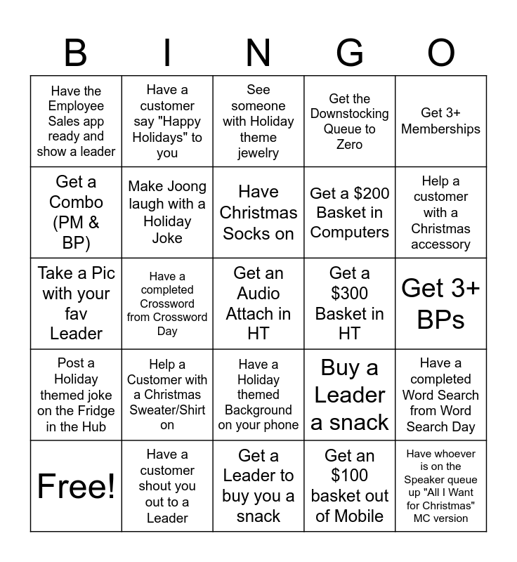 This bingo card has 25 words: Help a Customer with a Christmas Sweater/Shirt on, Get a Leader to buy you a snack, Have Christmas Socks on, Free!, Get 3+ Memberships, Have the Employee Sales app ready and show a leader, Get a Combo (PM & BP), Have a customer say "Happy Holidays" to you, Get a $300 Basket in HT, Have a Holiday themed Background on your phone, Get a $200 Basket in Computers, Take a Pic with your fav Leader, Buy a Leader a snack, Have a completed Word Search from Word Search Day, Make Joong laugh with a Holiday Joke, Have whoever is on the Speaker queue up "All I Want for Christmas" MC version, Get 3+ BPs, See someone with Holiday theme jewelry, Help a customer with a Christmas accessory, Have a completed Crossword from Crossword Day, Get an Audio Attach in HT, Have a customer shout you out to a Leader, Post a Holiday themed joke on the Fridge in the Hub, Get the Downstocking Queue to Zero and Get an $100 basket out of Mobile.