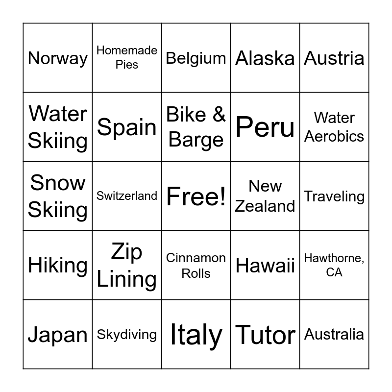 This bingo card has a free space and 56 words: Russia, Japan, Iceland, Norway, Italy, France, Spain, Portugal, Peru, Mexico, Alaska, Kenya, Tanzania, Ireland, England, Germany, Austria, Switzerland, Canada, Australia, New Zealand, Fiji, Hawaii, Belgium, River Cruises, Bike & Barge, Lake Tahoe, Pottery, Water Aerobics, Gardening, Art Classes, Biking, Baking, Cake Decorating, Traveling, Water Skiing, Snow Skiing, Camping, Hiking, Homemade Pies, Cinnamon Rolls, Snickerdoodles, Cookie Making, Crème Brûlée, Holiday Gatherings, Zip Lining, Skydiving, Piloting, Train Travel, 2nd Grade Teacher, Tutor, Landlady, Casper, WY, Brawley, CA, Hawthorne, CA and Ojai, CA.
