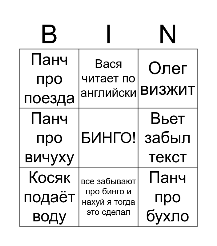 This bingo card has a free space and 8 words: Вьет забыл текст, Олег визжит, Вася читает по английски, Косяк подаёт воду, Панч про поезда, Панч про бухло, Панч про вичуху and все забывают про бинго и нахуй я тогда это сделал.
