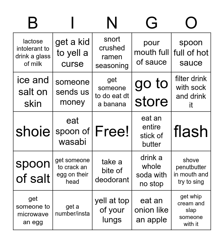 This bingo card has a free space and 24 words: get someone to crack an egg on their head, get a number/insta, get someone to do eat dt a banana, get someone to microwave an egg, spoon full of hot sauce, lactose intolerant to drink a glass of milk, ice and salt on skin, get a kid to yell a curse, eat an entire stick of butter, take a bite of deodorant, go to store, shoie, drink a whole soda with no stop, shove penutbutter in mouth and try to sing, someone sends us money, eat an onion like an apple, flash, snort crushed ramen seasoning, filter drink with sock and drink it, eat spoon of wasabi, get whip cream and slap someone with it, spoon of salt, pour mouth full of sauce and yell at top of your lungs.