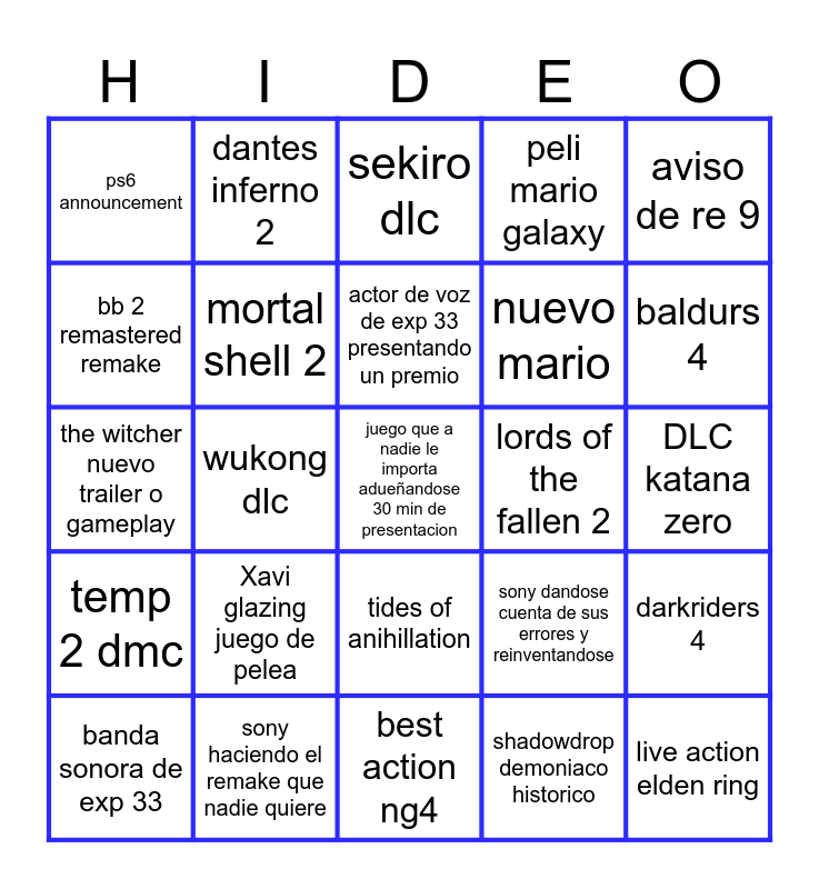This bingo card has a free space and 24 words: Xavi glazing juego de pelea, sony haciendo el remake que nadie quiere, actor de voz de exp 33 presentando un premio, banda sonora de exp 33, aviso de re 9, ps6 announcement, bb 2 remastered remake, dantes inferno 2, lords of the fallen 2, tides of anihillation, nuevo mario, the witcher nuevo trailer o gameplay, sony dandose cuenta de sus errores y reinventandose, darkriders 4, mortal shell 2, shadowdrop demoniaco historico, DLC katana zero, sekiro dlc, baldurs 4, wukong dlc, live action elden ring, temp 2 dmc, peli mario galaxy and best action ng4.